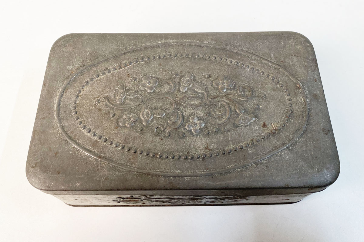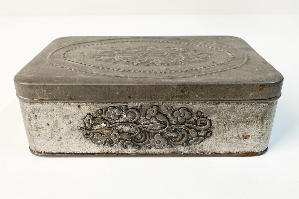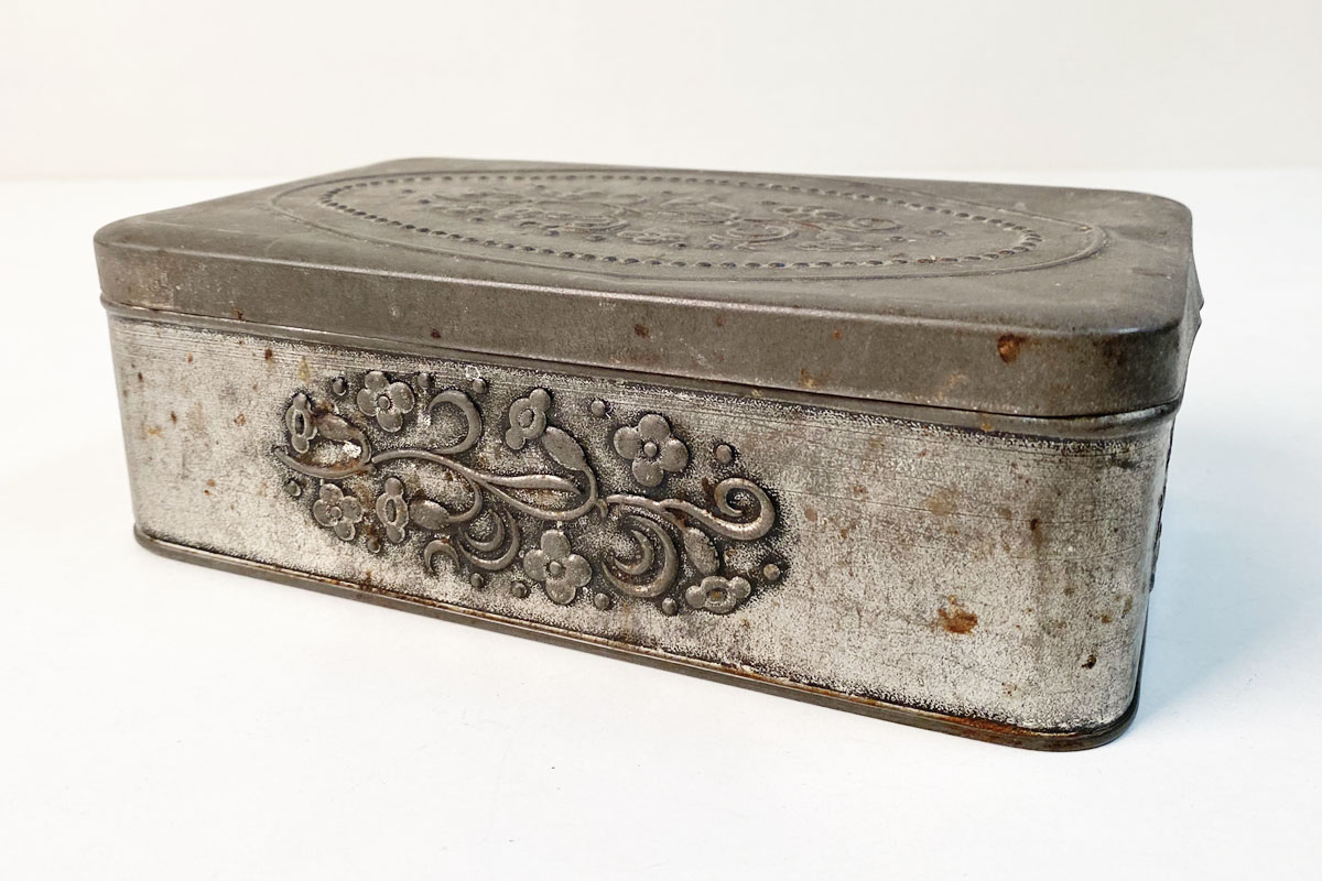 Aufbewahrungsdose vermutlich aus den 1920er Jahren. Diese Vorratsdose ist ein seltenes Sammlerstück mit dem klassische geprägten Blumenmuster. Die Metalldose ist in einem dem Alter entsprechenden Zustand mit viel Charme.