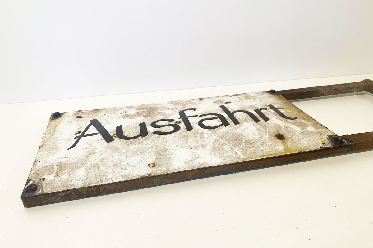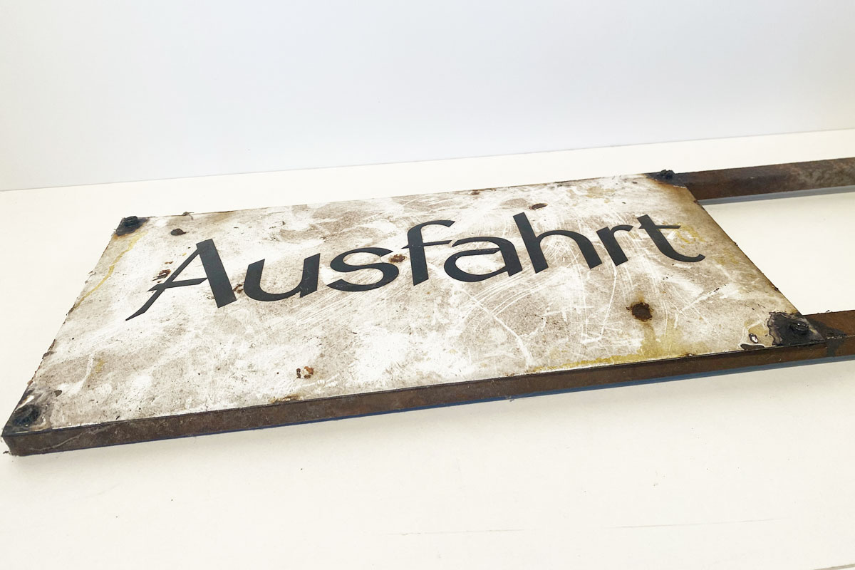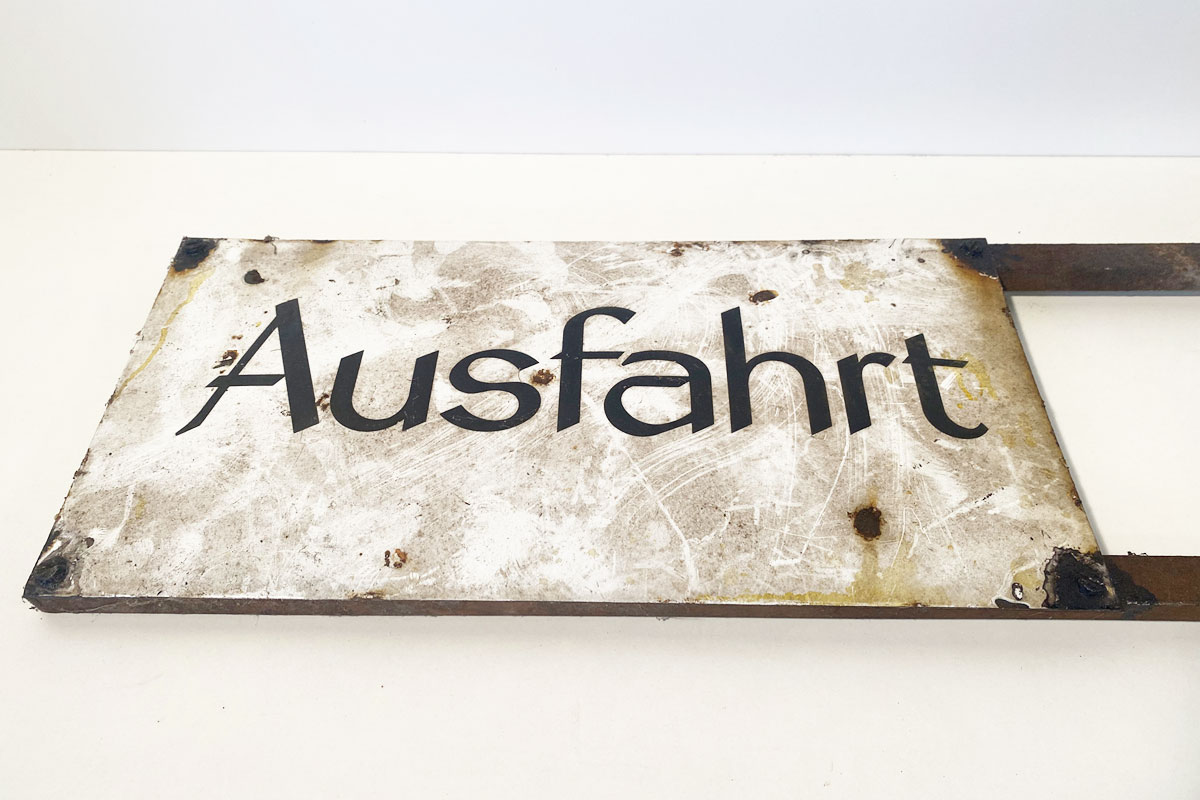 Altes, sehr altes, gewölbtes Emailleschild 'Ausfahrt'. Das Hinweisschild mit vier Schraublöcher ist auf ein Eisengestell montiert. Das Schild ist einem ungereinigten Fund-Zustand.