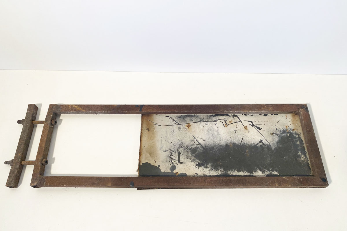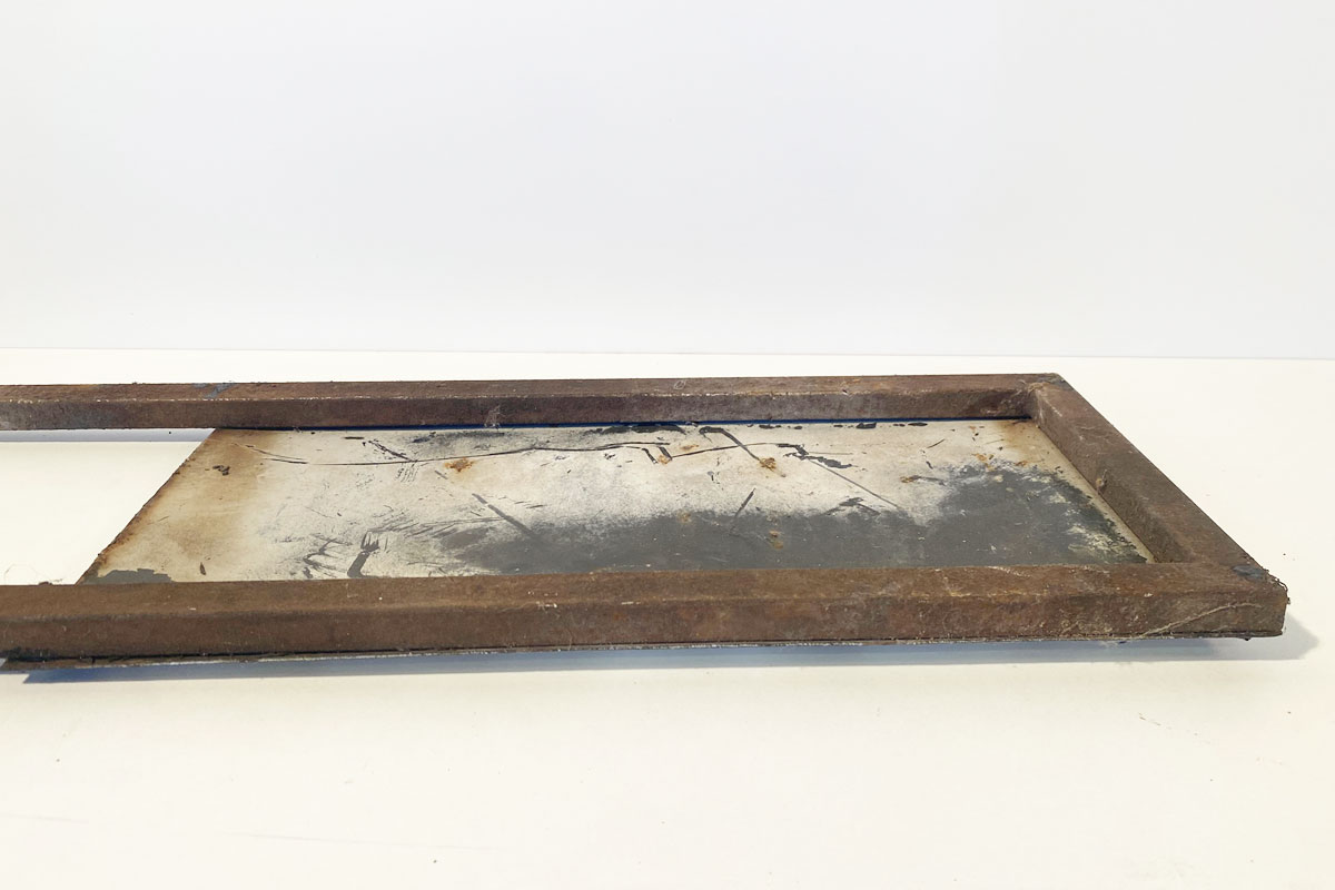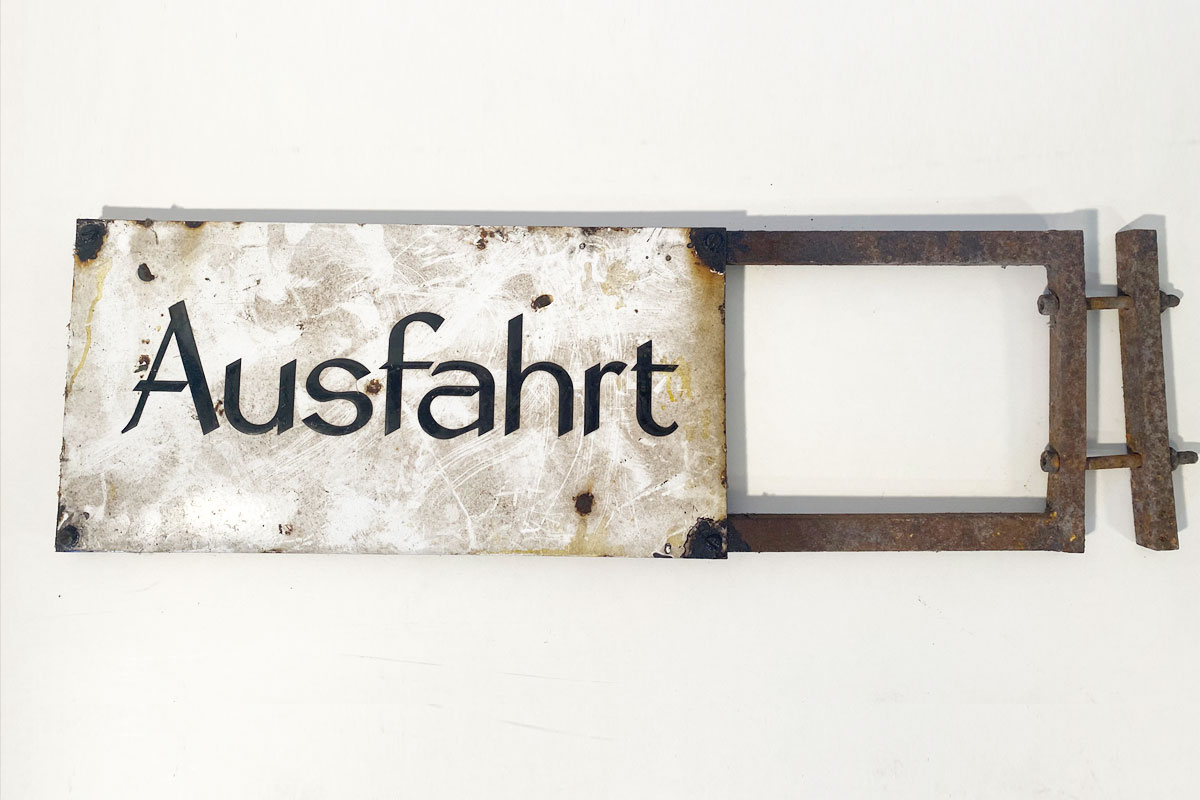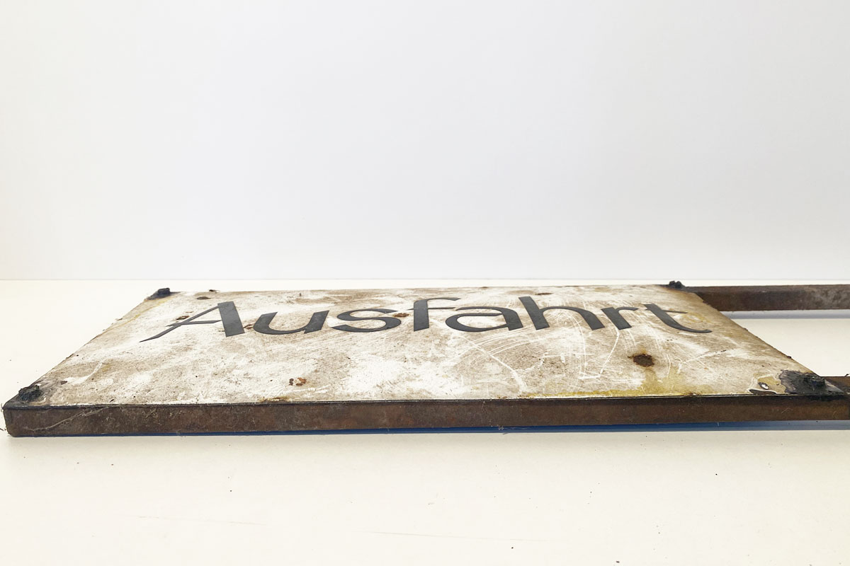 Altes, sehr altes, gewölbtes Emailleschild 'Ausfahrt'. Das Hinweisschild mit vier Schraublöcher ist auf ein Eisengestell montiert. Das Schild ist einem ungereinigten Fund-Zustand.