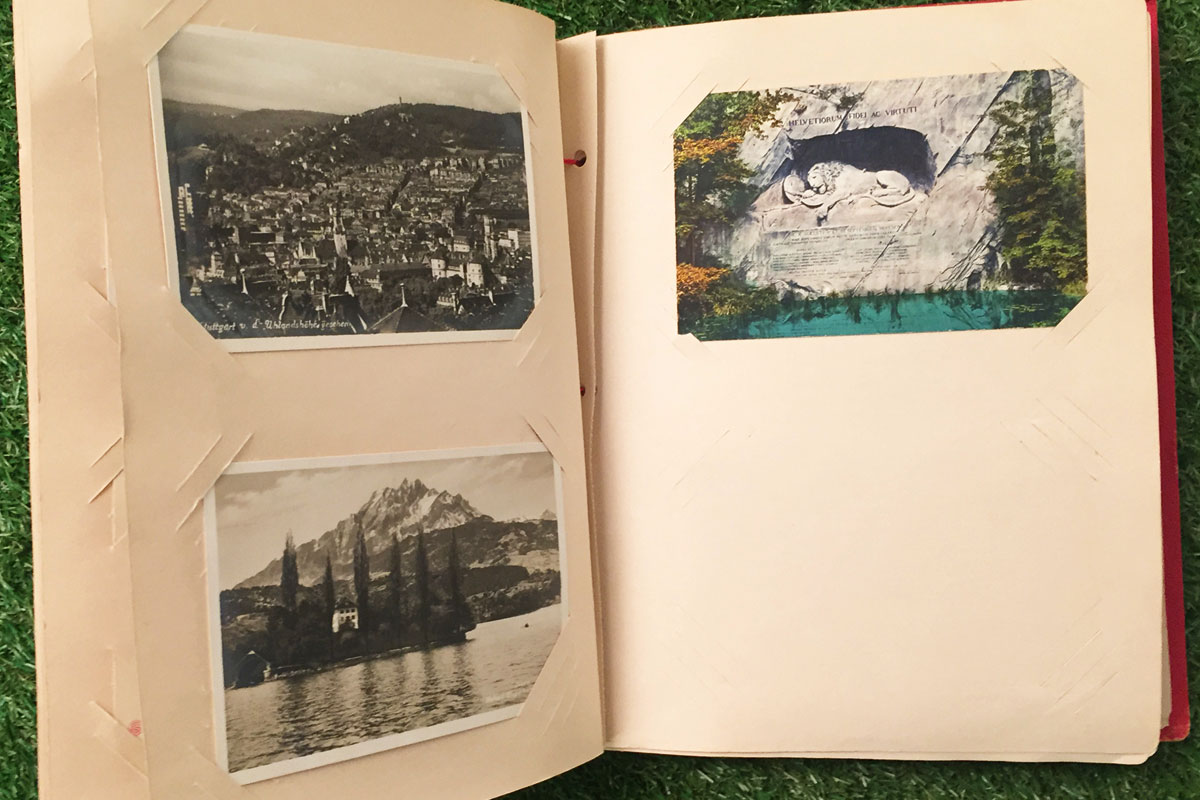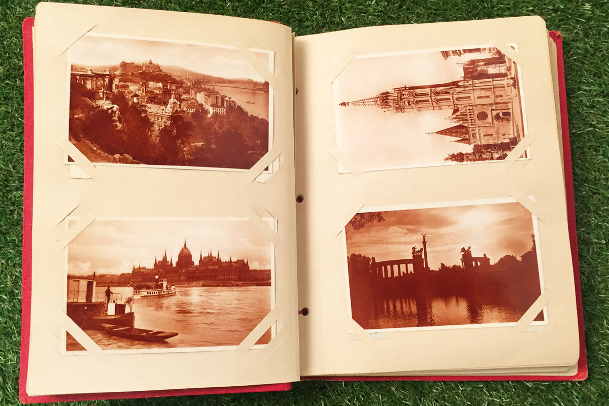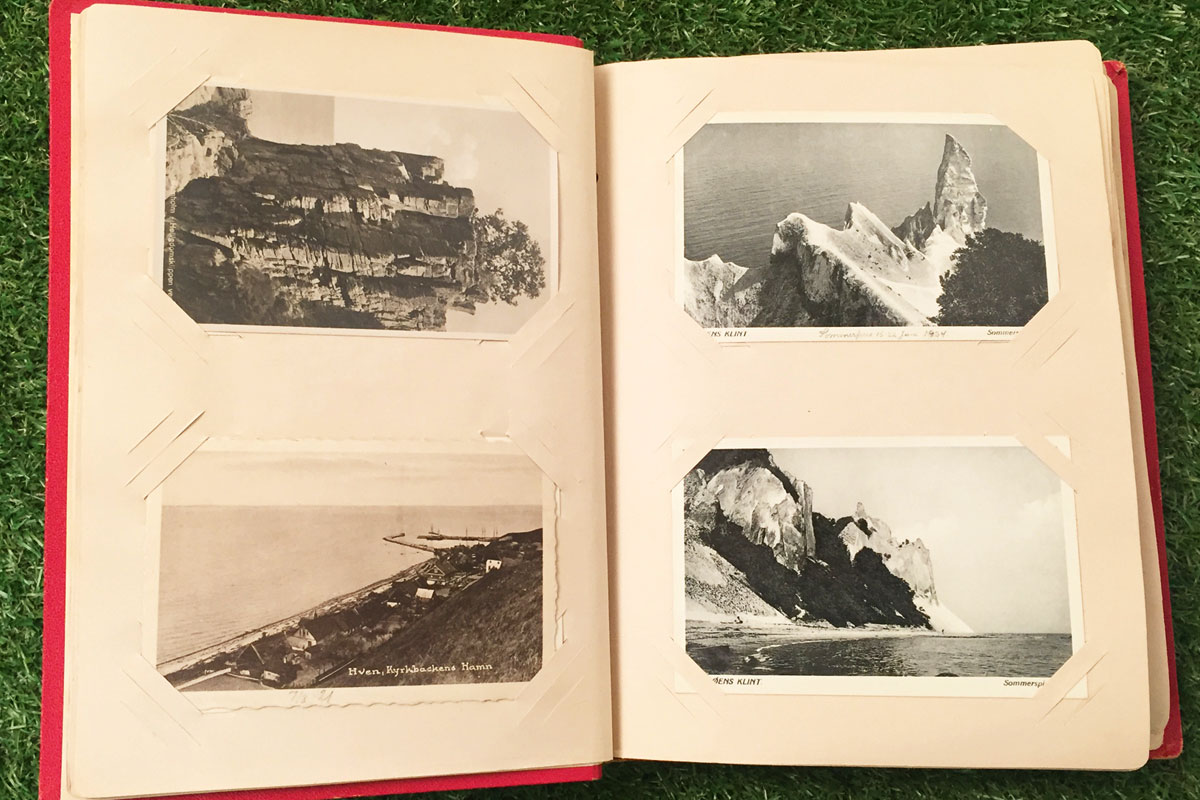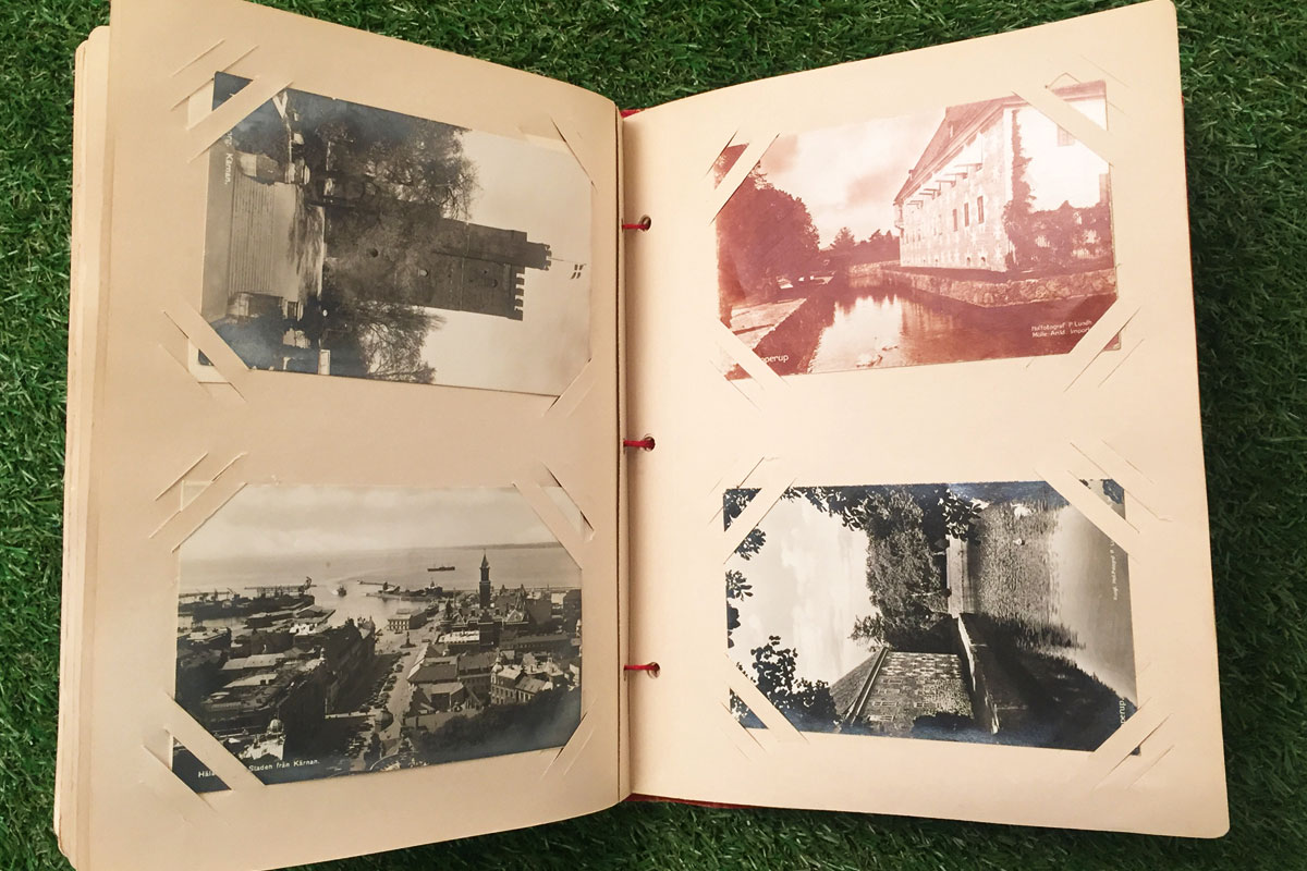 Ansichtskarten Album / Buch mit über 100 alten Postkarten. Ein dänischer Reisender hat die Karten aus der ganzen Welt zusammengetragen, daher 'Postkort'.