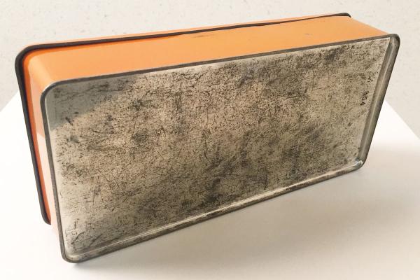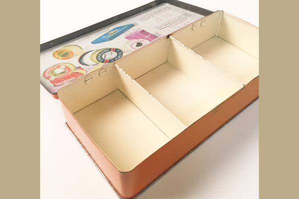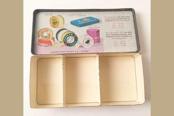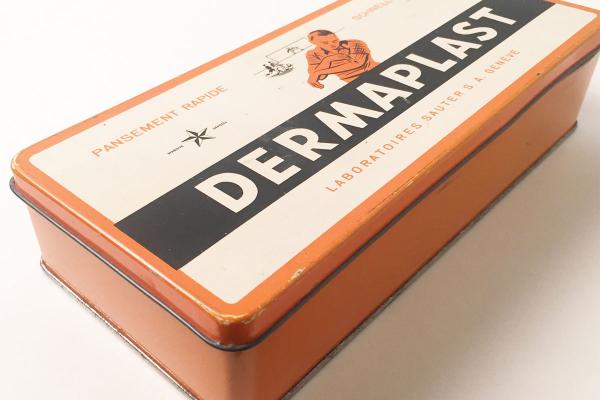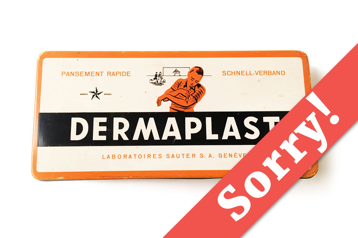 Alte grosse Blechdose der Schweizer Firma DERMAPLAST. Sehr rar und selten zu finden! Top Zustand. Grösse 11 x 23.5 x 4.8 cm.