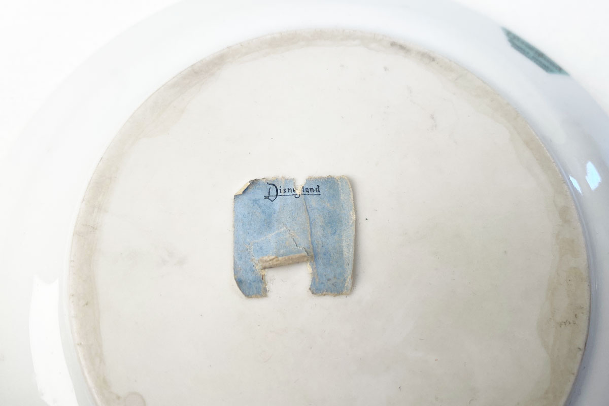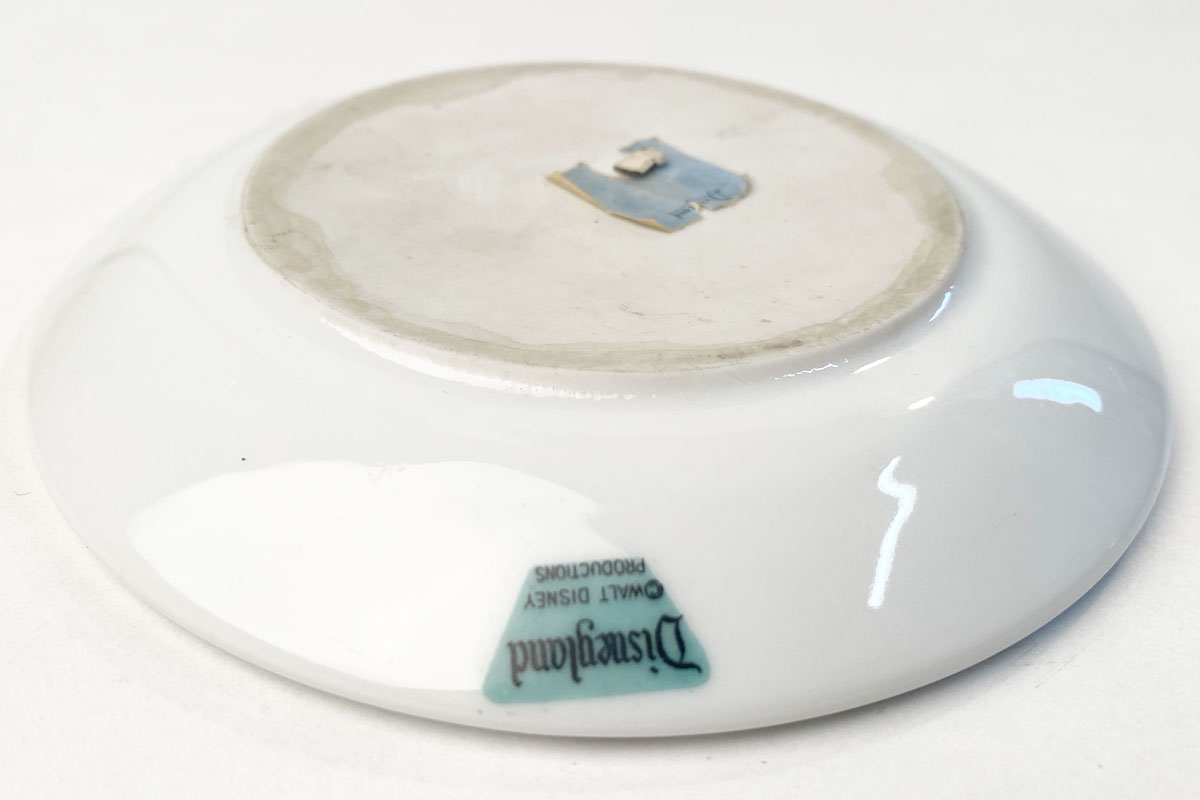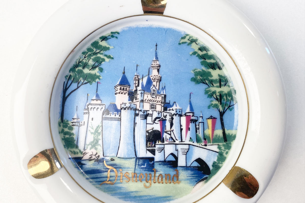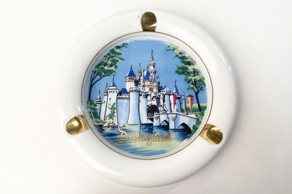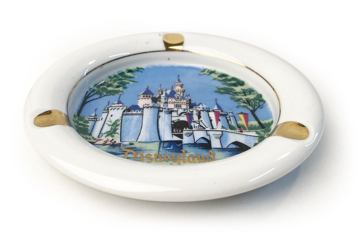 Seltener Porzellan Aschenbecher aus den 60er Jahren aus dem Disneyland. Der Souvenir Aschenbecher zeigt das Dornröschenschloss mit goldenen Farbdetails am Rand.