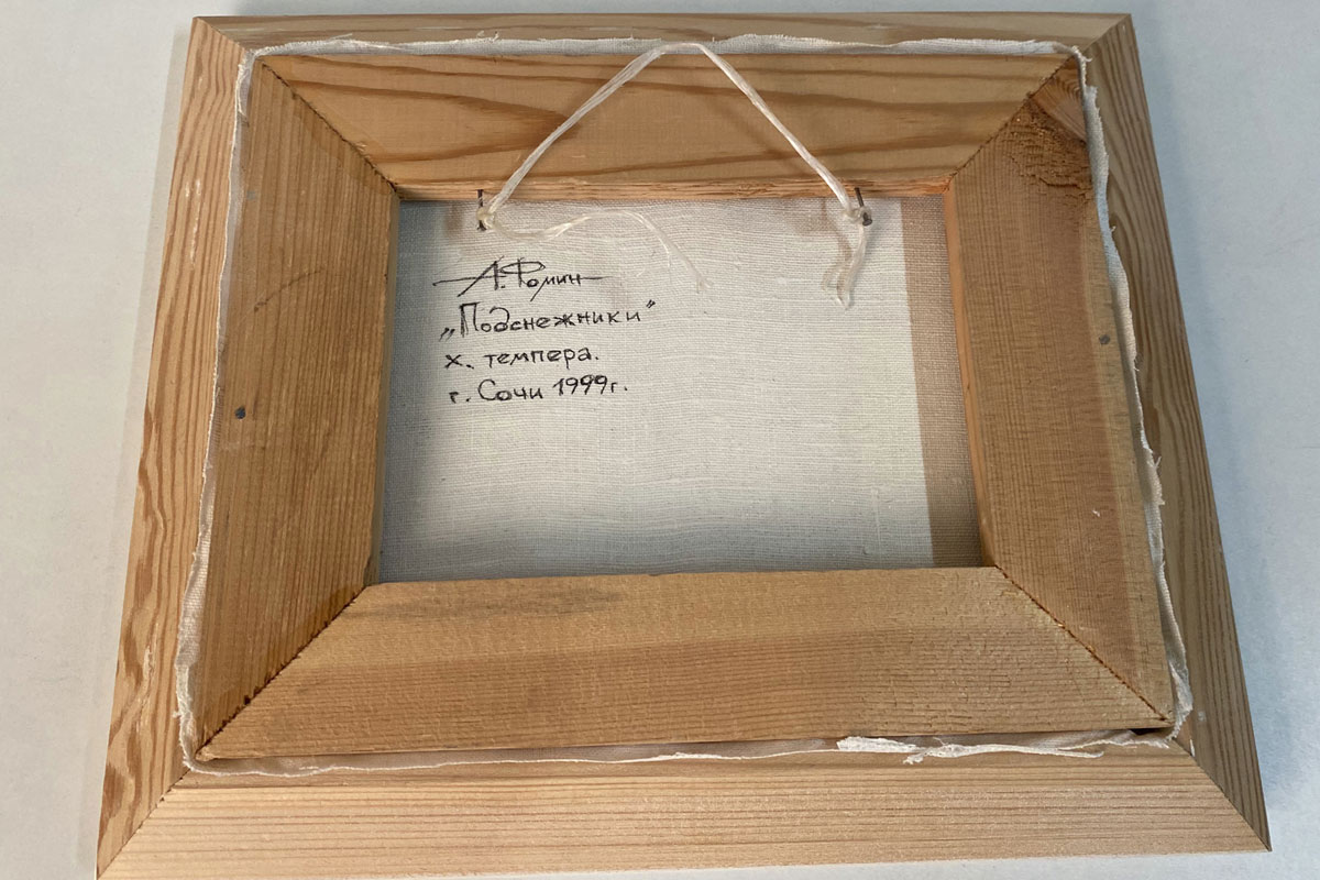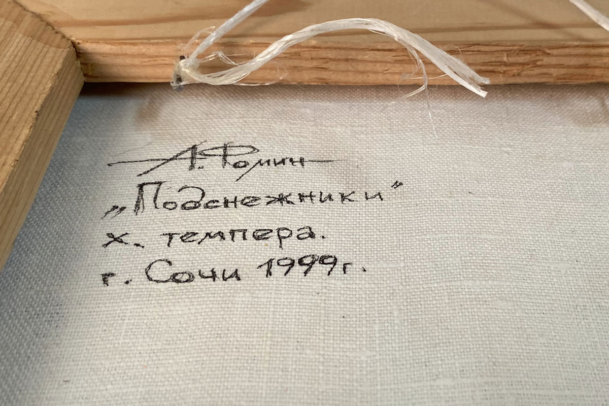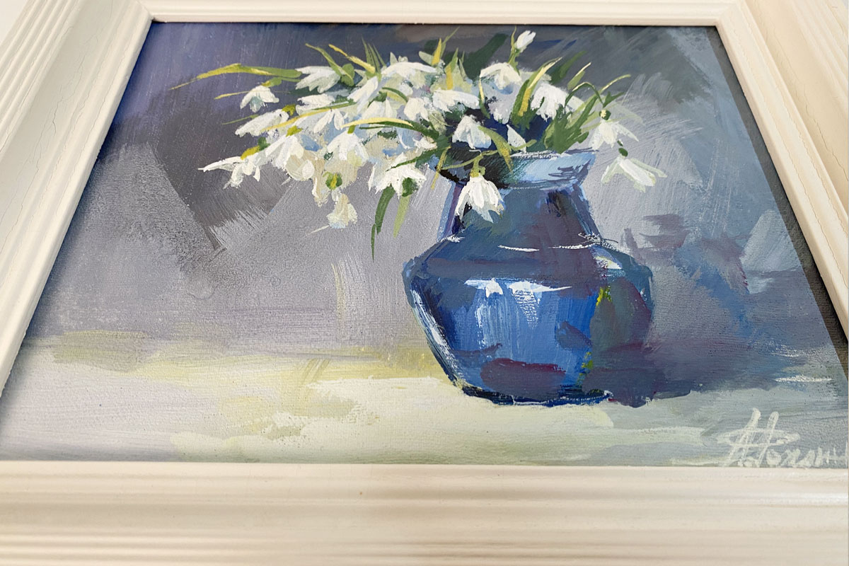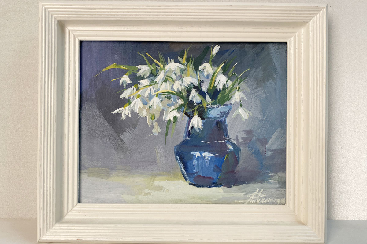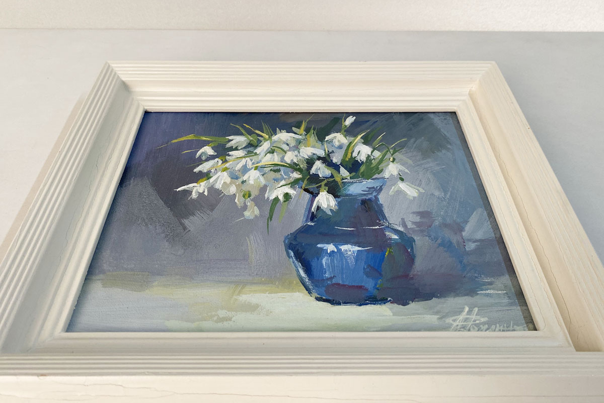 Schönes Ölgemälde von einem Bund Schneeglöckchen in einer blauen Vase aus dem Jahr 1999. Das Bild ist auf Leinwand gemalt in einem einfachen, weissen Holzrahmen. Das Bild ist unten rechts signiert.