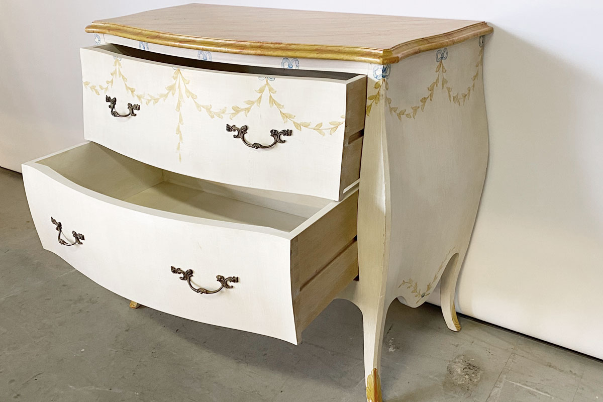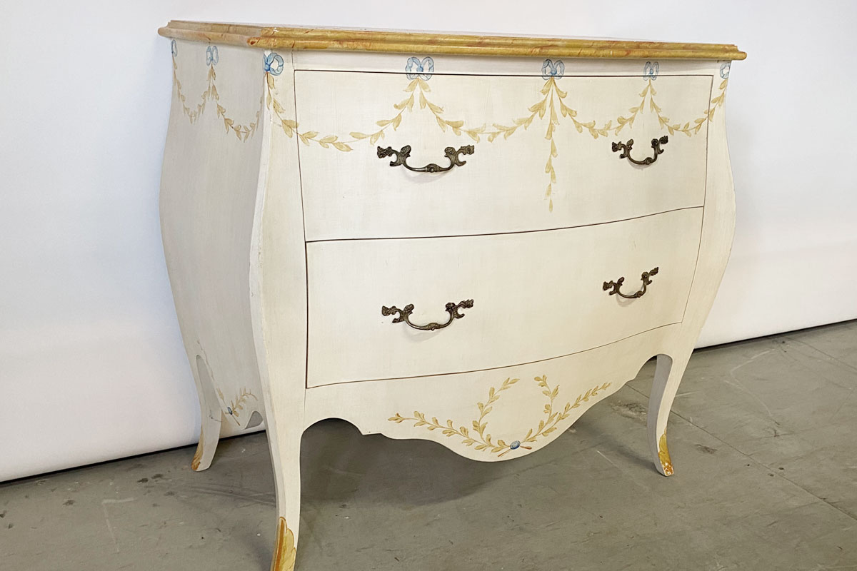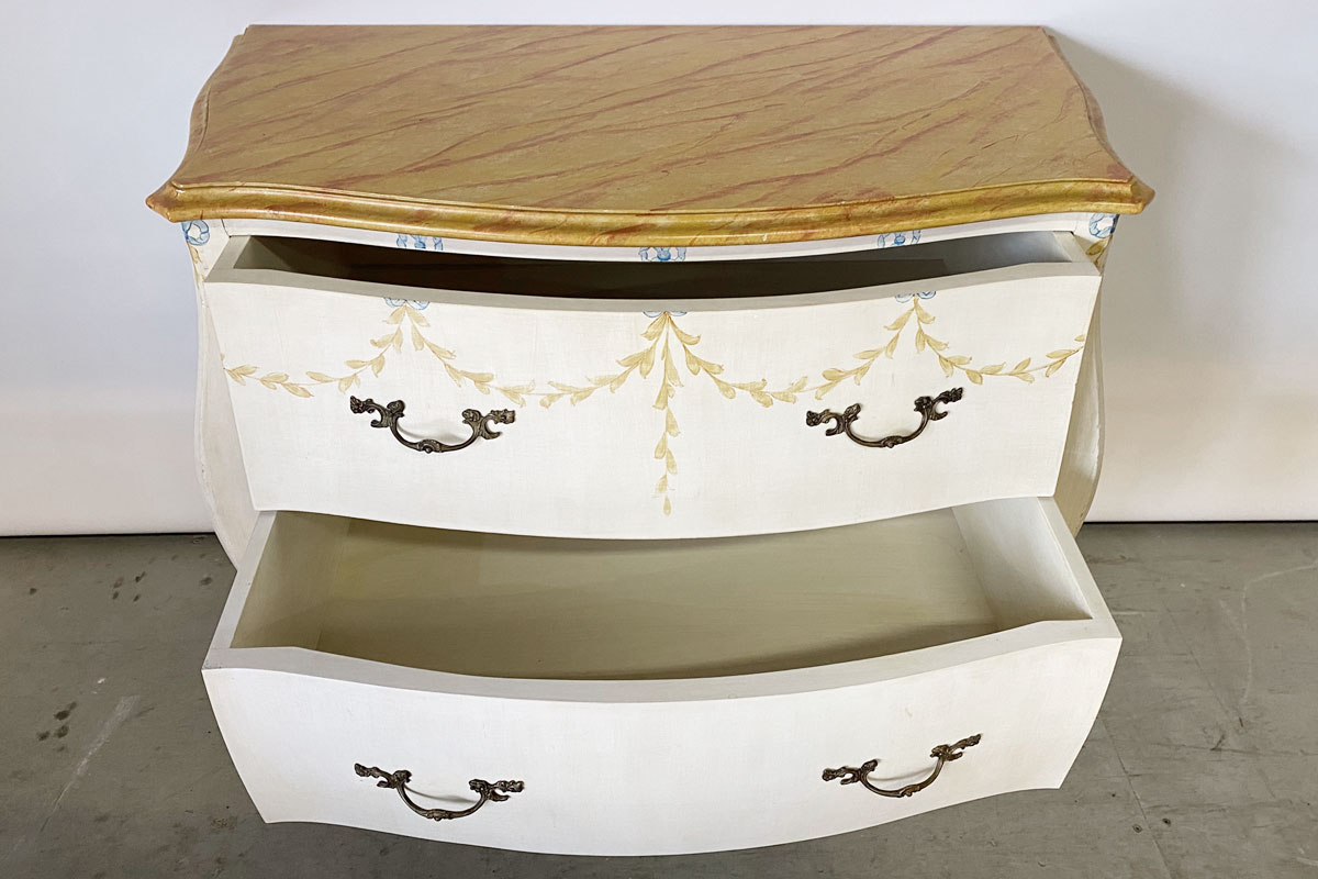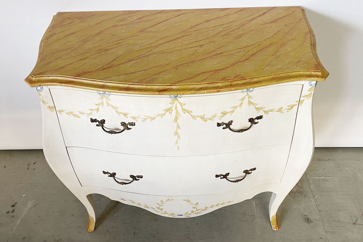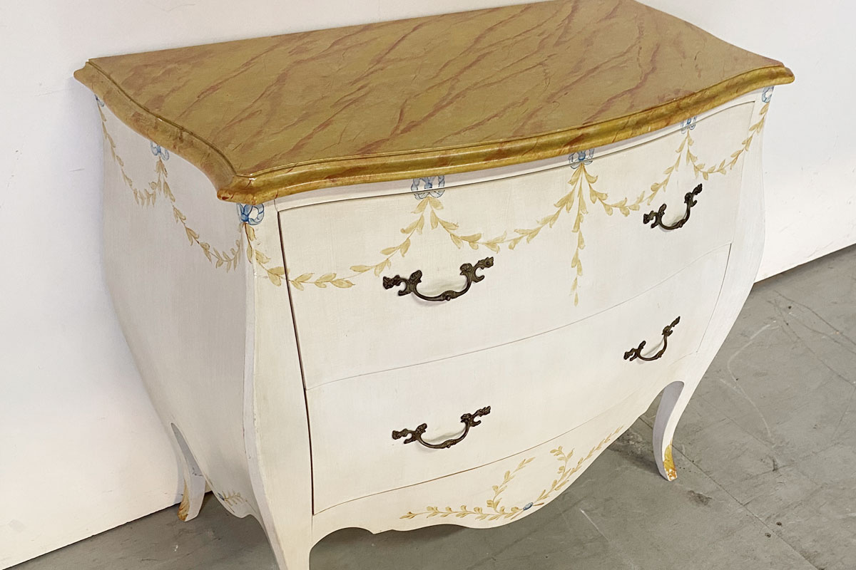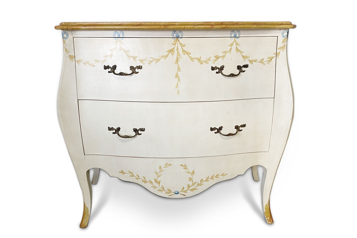 Alte Holzkommode im Louis Style mit 2 Schubladen mit Metallgriffen. Das cremefarbene Möbel wurde einem Blattmuster sowie einem 'Marmoreffekt' verziert.