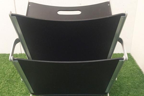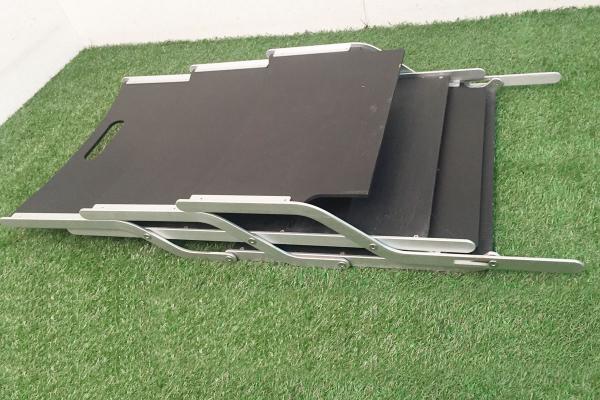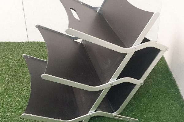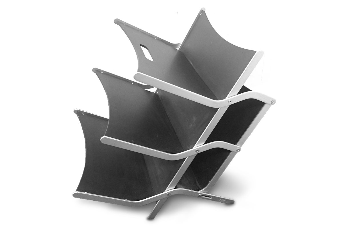 Zeitungsständer Klassiker von Ycami Modell 'Press', Design von Raul Barbieri / Italien 1993. Rahmen aus Aluminium, Einlagen aus lackiertem Sperrholz. Faltbar.